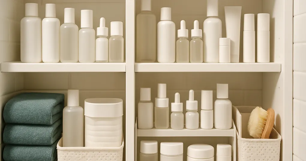 Products that can stay if ventilation is adequate: Most skincare products with preserved formulations handle normal bathroom humidity without significant degradation within their PAO period. Products in airtight, opaque, or pump dispensers are more humidity-resistant than open jars.